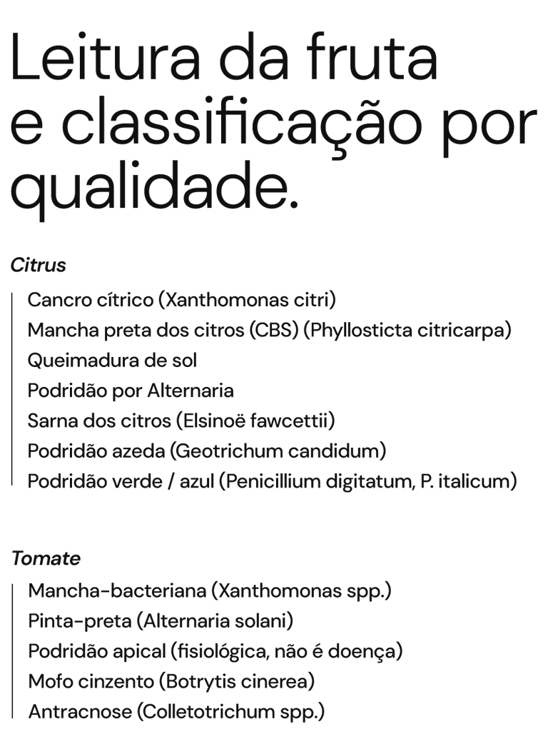 Classificação de frutas por cor, tamanho, peso e qualidade.